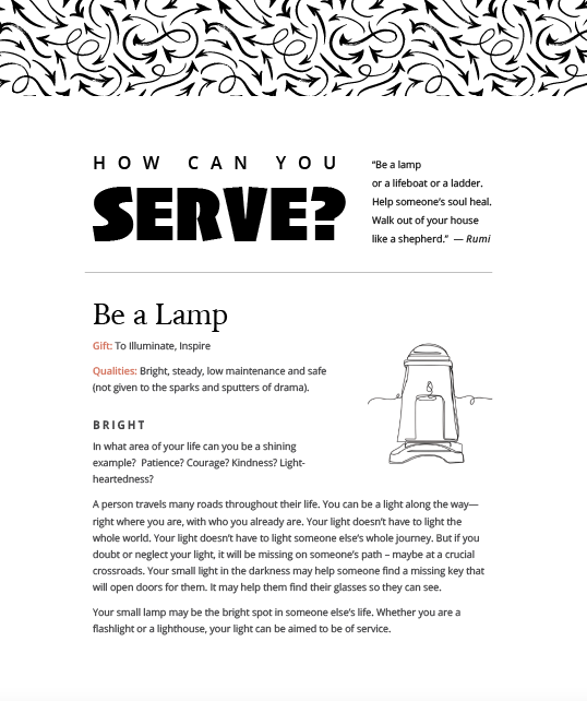 How Can You Serve, based on a famous Rumi quote, breaks down how to be a lamp, a lifeboat or a ladder to aid someone else.